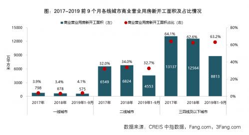 在商業(yè)用房市場,報告顯示,1~9 月,全國及三四線城市商業(yè)營業(yè)用房開發(fā)投資額、新開工及銷售面積均同比下降;三四線及以下城市商業(yè)營業(yè)用房新開工及銷售規(guī)模持續(xù)領(lǐng)先于一二線城市。